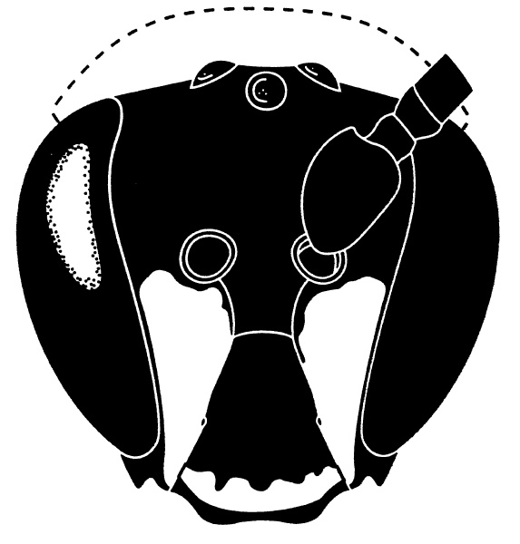 Hylaeus setosifronsIslands: HawaiiLocations: Hawaii - (Earthquake Trail, Kipuka Puaulu, Mauna Loa Est., Tree Molds, Volcano) Habitats: Montane mesic and wet forest. Plants: Cheirodendron, Metrosideros, Psychotria, Rubus, Santalum Xerces: No info. Insects of Hawaii: Large bees with punctured terga and dark wings. Male scape moderately dilated, face with ivory marks in lower paraocular areas and sometimes subapically on clypeus. Female pronotal collar with transverse ivory stripe complete or interrupted; tibiae with ivory stripes; basitarsi with or without ivory stripes. Both sexes with unusual dark, erect setae on face, almost all body hair black. This species is widely distributed in the wet and mesic forest around Kilauea, but is uncommon. Nearly all of the body hair is black, and the erect clypeal hair is distinctive. Insects of Hawaii Volume 17
