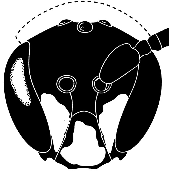 Hylaeus specularisIslands: Kauai, Oahu, Maui, HawaiiLocations: Kauai - (Awaawapuhi Trail, Na Pali-Kona FR) Oahu - (Manana Trail) Hawaii - (KFU) Habitats: Montane wet to mesic forest Plants: Cheirodendron, Claoxylon, Metrosideros, Myoporum, Scaevola Xerces: No info. Insects of Hawaii: Small bees with slightly smoky wings. Male face with three nearly separate marks (clypeus except the basal and lateral edges and paraocular areas up to or slightly above antennal sockets, but not the supraclypeal area); frons with dark spot in middle; scape moderately dilated and with long hair along median edge; pronotum and legs marked with yellow. Closely related to H. crabronoides, but without a thick head and with a large impunctate area above antennal socket. Female face with lowerparaocular area with irregular triangular yellow mark along the eye and up to level of antennal socket, rarely with a transverse apical mark on the clypeus; pronotum with yellow stripes on collar at sides and yellow lobes; legs with small, basal yellow spots on tibiae. Similar to H. dumetorum, but with the upper frons smooth and lustrous; see remarks for that species. Both Perkins (1911:723) and Fullaway (1918:395) commented on the possible synonymy of H. specularis, described from the female taken at Kilauea, and H. homoeochromus, described later from the male taken at Kilauea. The only type available is that of H. specularis. Hylaeus homoeochromus is treated here as a junior synonym because males and females that match the descriptions of the respective taxa have been collected together by D. T. Fullaway and KM, and have been genetically associated. Two females from Maui appear to be this species, although the impunctate area next to the lateral ocellus is not as shiny as in other specimens. Regardless of their identity, the recent discovery of this species on Kauai and Oahu means that it almost certainly inhabits Maui Nui as well. Males from Kauai have consistently broader, more curved, and more pointed gonoforceps than Hawaii specimens. Males from Oahu were not available to compare. Although found on many islands, it appears to be local and rare on all. Insects of Hawaii Volume 17